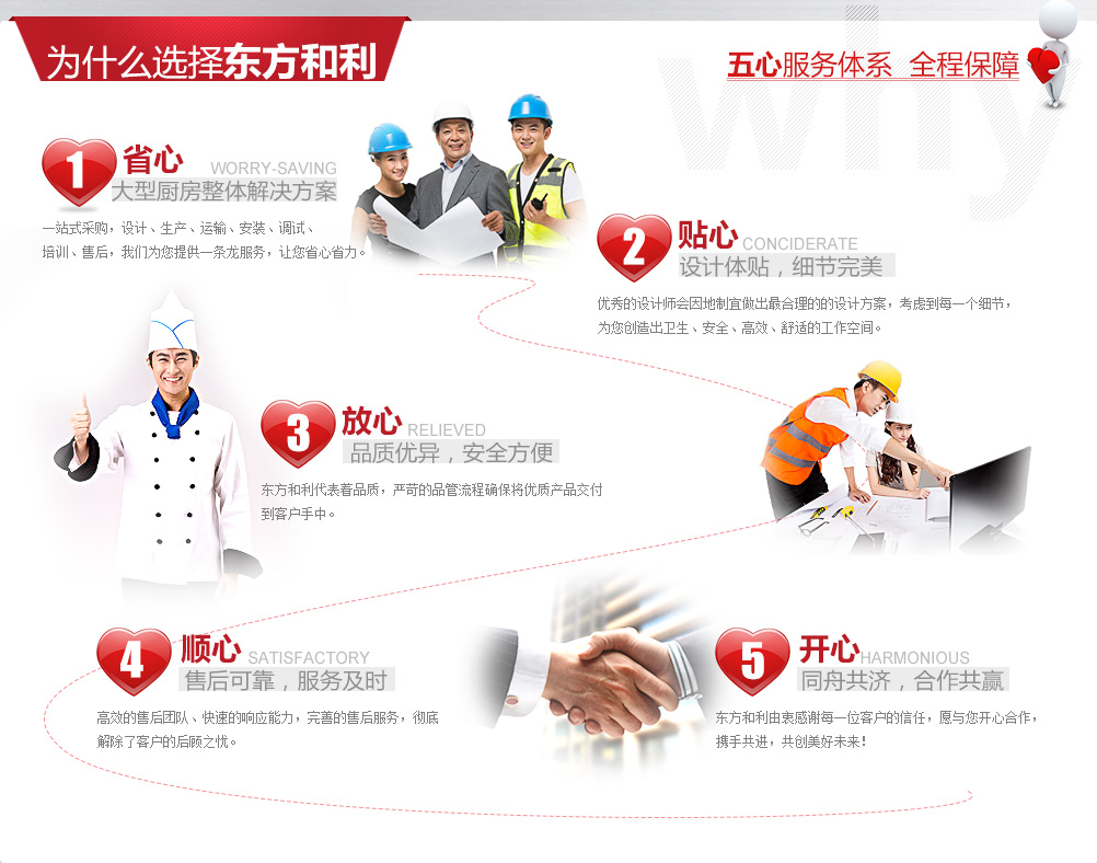 沈陽(yáng)東方和利廚業(yè)有限公司,是一家業(yè)務(wù)覆蓋全國(guó)的廚房設(shè)備制造商及商用廚房系統(tǒng)集成服務(wù)商,致力于為廣大用戶(hù)提供高品質(zhì)的廚房設(shè)備和完善的工程服務(wù)。 與傳統(tǒng)的"生產(chǎn)商"或"銷(xiāo)售商"不同,東方和利并不僅僅生產(chǎn)或銷(xiāo)售廚房設(shè)備,而是為客戶(hù)提供廚房整體解決方案的"服務(wù)商"。我們以客戶(hù)需求為中心,采用"五心"服務(wù)體系全程保障,為客戶(hù)提供廚房設(shè)計(jì)咨詢(xún)、設(shè)備生產(chǎn)、運(yùn)輸、安裝、調(diào)試、培訓(xùn)、售后等全套服務(wù),讓您體驗(yàn)到管家式服務(wù)的周到與便利。 東方和利憑借質(zhì)量和服務(wù)優(yōu)勢(shì),在全國(guó)各大廚房工程招標(biāo)中不斷中標(biāo),客戶(hù)涵蓋了單位食堂(企業(yè)、政府機(jī)關(guān)、部隊(duì)、學(xué)校、醫(yī)院)、星級(jí)酒店、餐飲、中央廚房、團(tuán)膳配餐等多種類(lèi)型。 我公司同時(shí)代理多種名牌食品機(jī)械、酒店用品,為客戶(hù)提供"一站式"商用廚具整體解決方案。我們秉承"質(zhì)量第一,信譽(yù)至上"的原則,希望能在不久的將來(lái)為您提供優(yōu)質(zhì)的產(chǎn)品和服務(wù)!