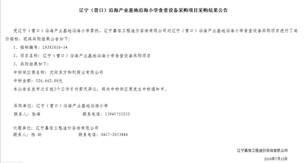 今天已經(jīng)是2016年的第200天了,而今年你的目標(biāo)完成了多少呢?沈陽(yáng)東方和利廚業(yè)一直秉承"質(zhì)量第一,信譽(yù)至上"的原則,一步一個(gè)腳印朝著自己的目標(biāo)腳踏實(shí)地的前行。最近更是屢傳捷報(bào),就在7月12日,沈陽(yáng)東方和利廚業(yè)接到營(yíng)口市政府采購(gòu)中心發(fā)出的中標(biāo)公告,成功中標(biāo)營(yíng)口沿海產(chǎn)業(yè)基地小學(xué)。(ps:點(diǎn)開(kāi)圖片查看更清楚~)