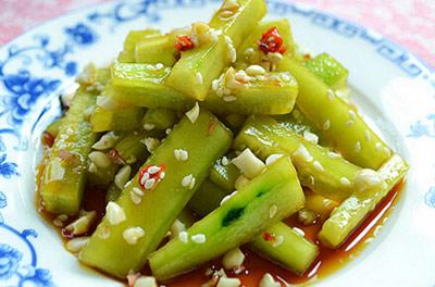 1、黃瓜一條洗凈去皮,準(zhǔn)備少許熟花生壓成碎;