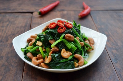 3、菠菜撈出。攥干水,切成寸段,大蒜拍扁切碎,腰果壓成大大小小的碎粒;
