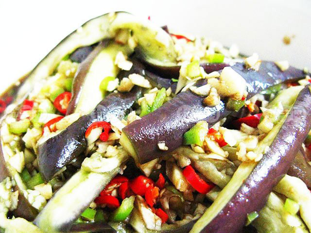 1、茄子洗凈切成薄一點(diǎn)的長(zhǎng)條,放入油鍋中慢煎,煎至軟熟后盛出待用;