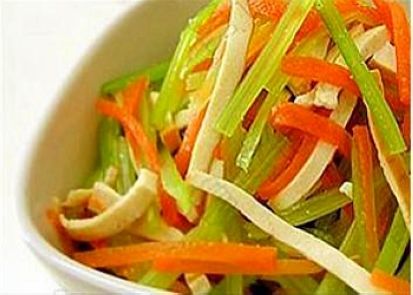 2、鍋中水煮開后,放入芹菜段,再煮滾后放入豆腐皮和胡蘿卜絲,見芹菜稍一變色即可撈出;
