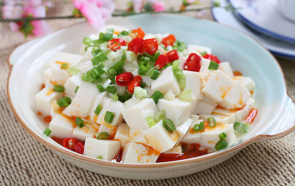 2、淋在白豆腐上,可根據(jù)自己口味放上榨菜或肉末;