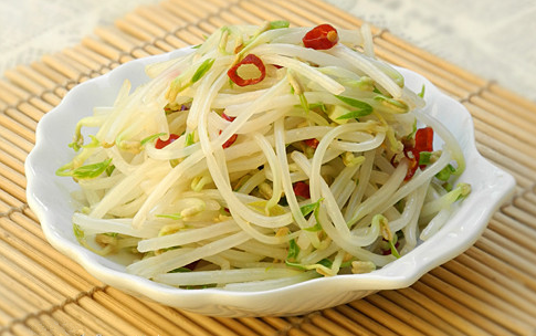 1、辣椒洗凈切碎、香蔥洗凈切段,綠豆芽洗凈,將豆芽在開水中攪拌,使其均勻受熱,燙豆芽的時(shí)間10秒鐘即可,這樣既保持了豆芽的水分,又口感爽脆;