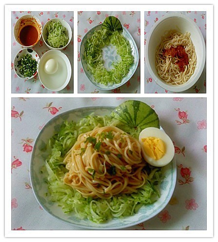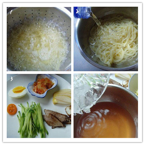 2、將兩人份的冷面放入開水煮3分鐘撈出,用冰水沖洗后放到瀝水籃中瀝干水分,之后分別裝入兩個大碗中,放入兩大匙之前拌好的醬料,加上黃瓜絲、黃豆芽和半個煮熟的雞蛋;