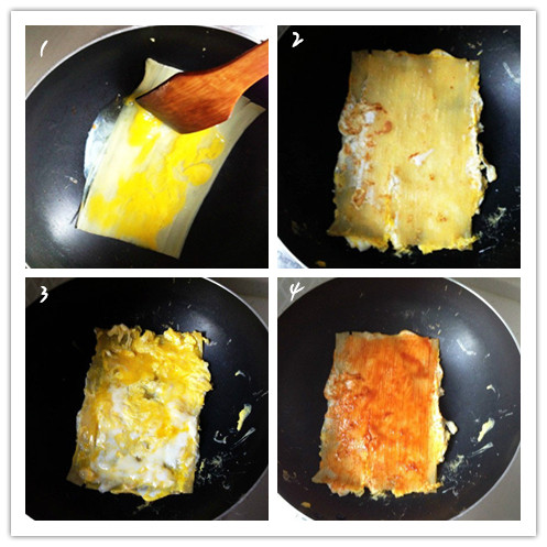 2、將雞蛋涂勻;3、等待雞蛋稍微凝固;4、翻面;