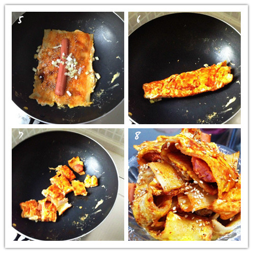 5、涂上預(yù)先調(diào)好的醬,將小火煎熱的火腿腸放入,加少量醋、孜然、鹽、香菜末、蔥末;6、將烤冷面從兩側(cè)向中間裹住香腸;7、用木鏟切成小段;8、出鍋,大功告成。