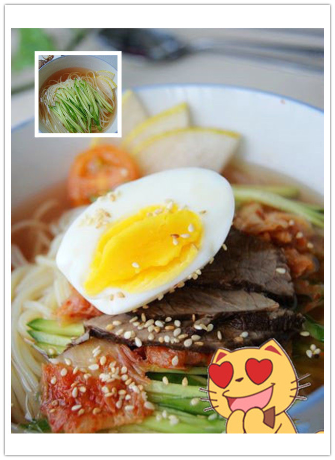 5、在冷面碗中,加入調(diào)好比例的冷面湯。再加入牛肉片、泡菜、黃瓜、雞蛋、冰塊,撒上白芝麻即可享用。