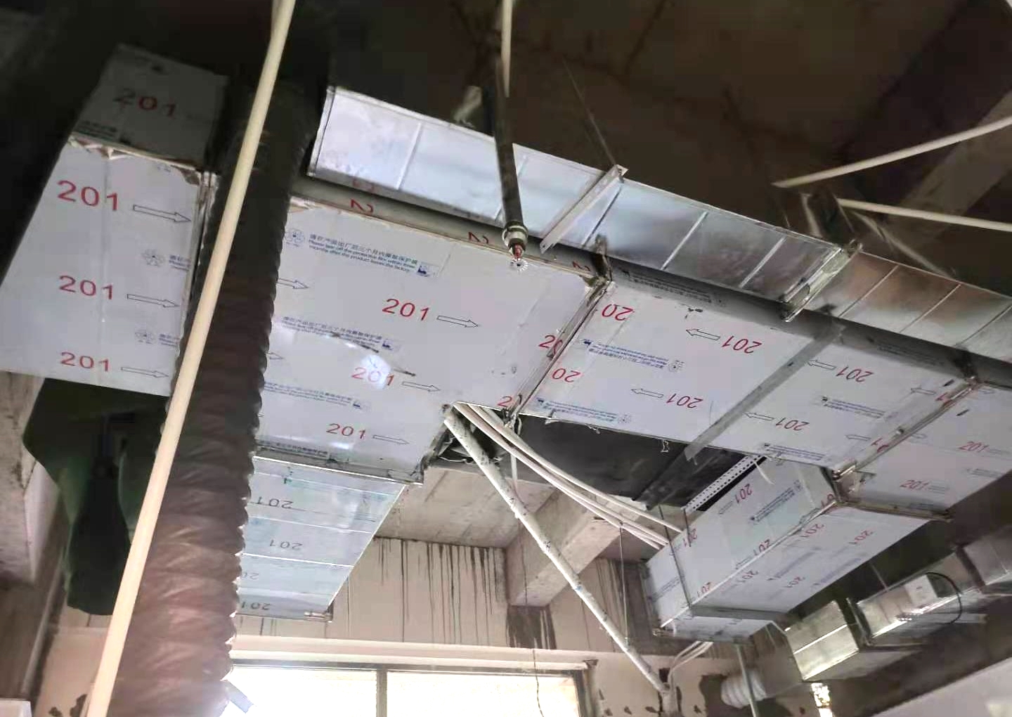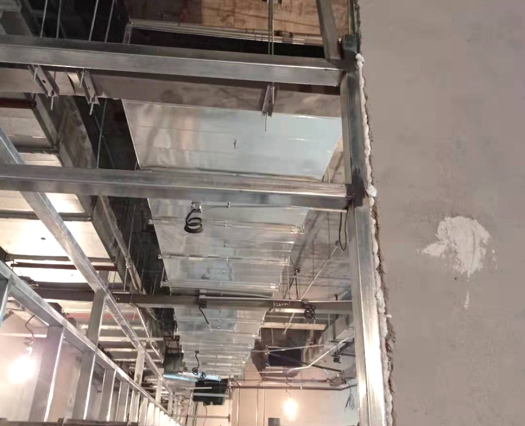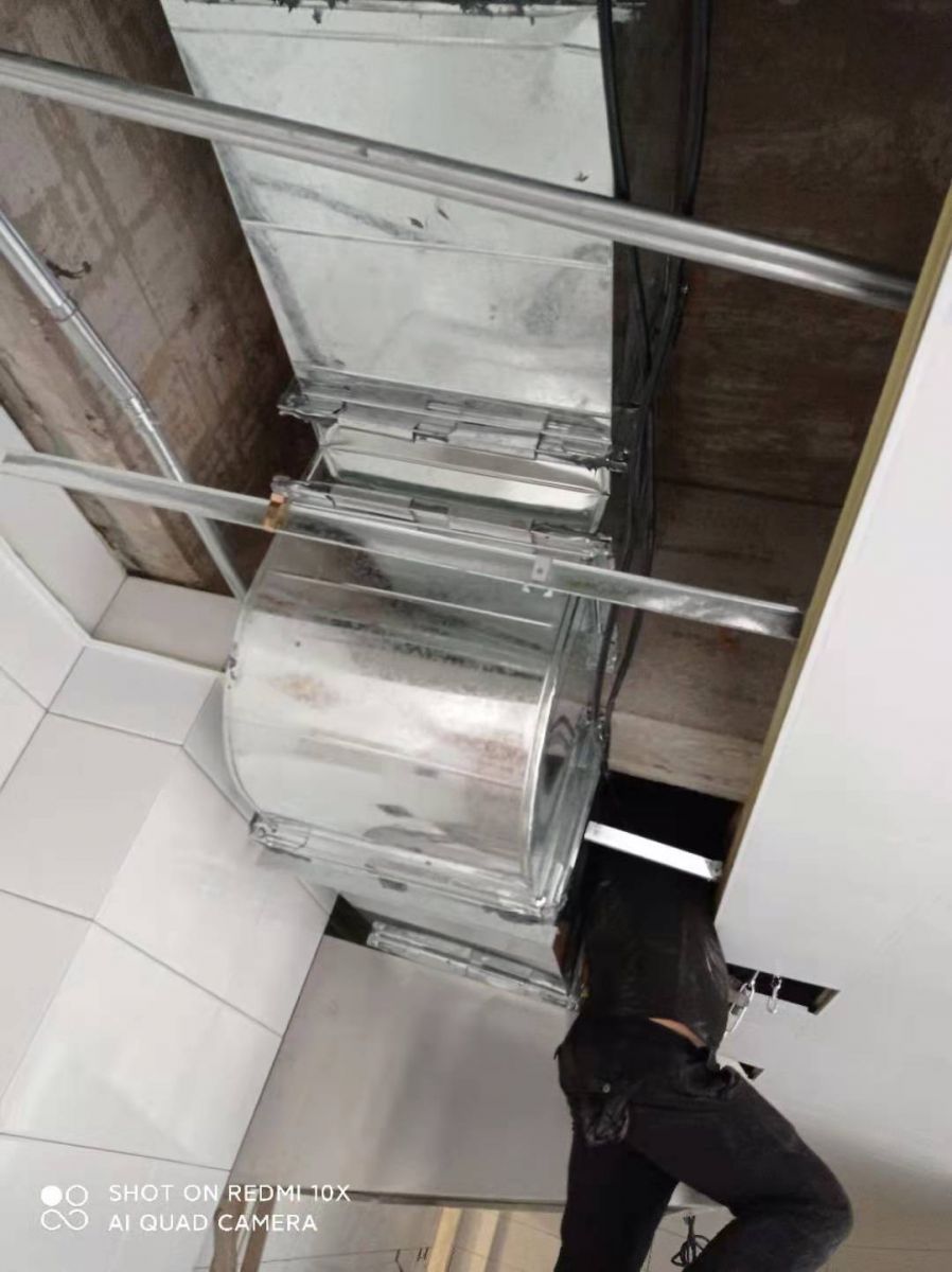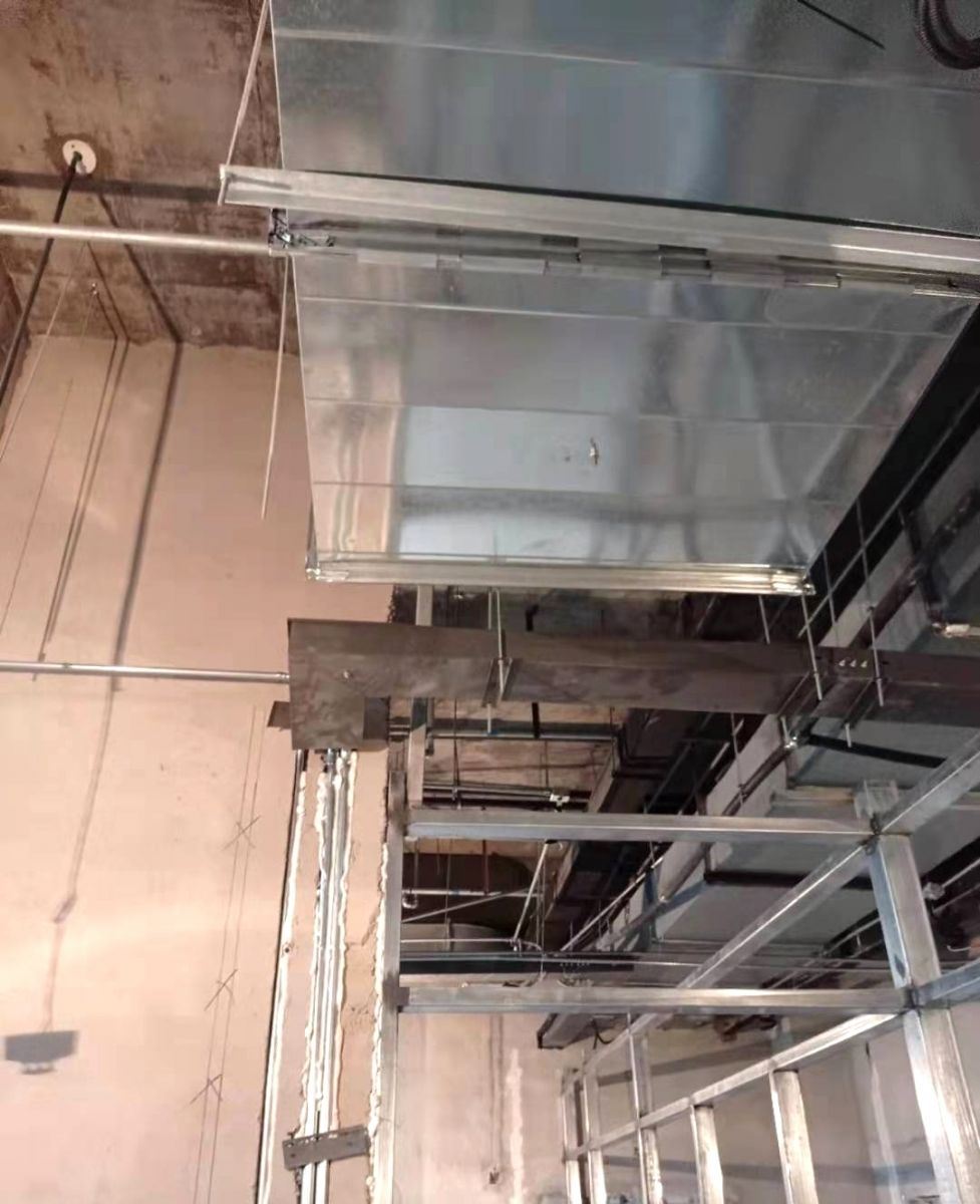 副食間、主食間煙罩風(fēng)管對接完成,五樓明檔煙罩吊完